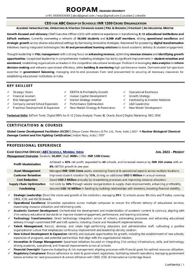 The new resume positioned Mr. Roopam not just as an education administrator, but as a transformational leader capable of driving scale, profitability, innovation, and strategic growth in the academic sector. It now serves as a compelling narrative – one that can open doors for board-level roles, advisory consulting, or even global education assignments.