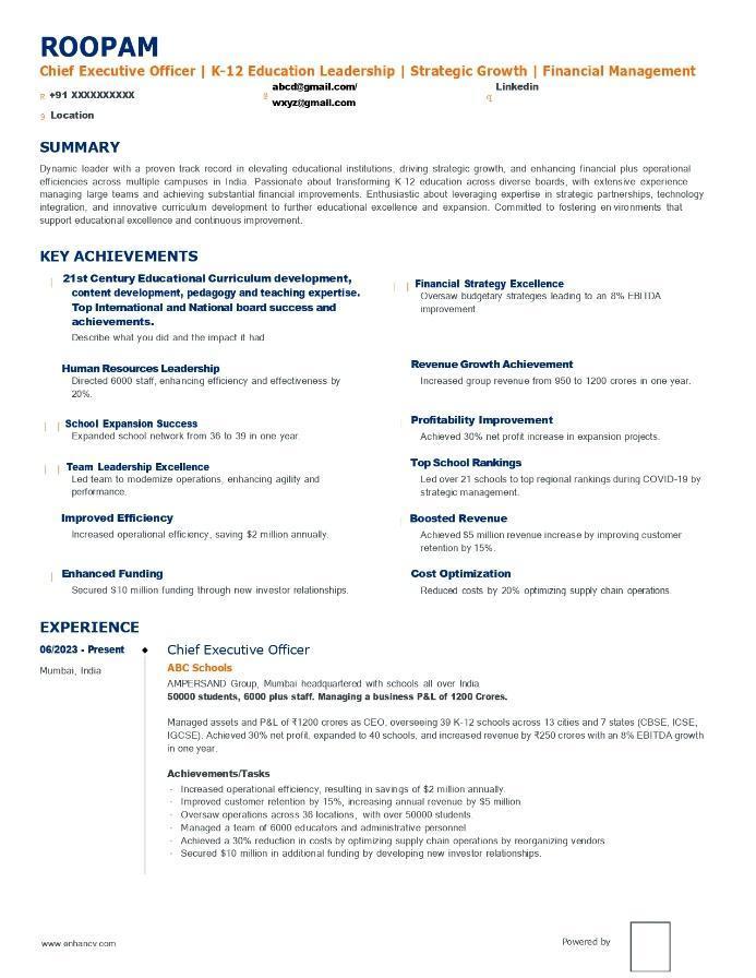 - Executive Branding & Summary Rewriting: We started by crafting a compelling professional headline that immediately establishes the client’s authority: ‘CEO For ABC Group Of Schools: INR 1200 Crore Organization Academic Infrastructure, Operations & Strategic Expansion Leader | P&L & Business | Strategist | An Influential Mentor.’ This was followed by a strong executive summary that introduced his core leadership strengths, his transformative work across multiple school networks, and his ability to drive growth using a data-led, tech-forward approach. The summary was designed to convey both experience and vision – a key trait at the CXO level.
